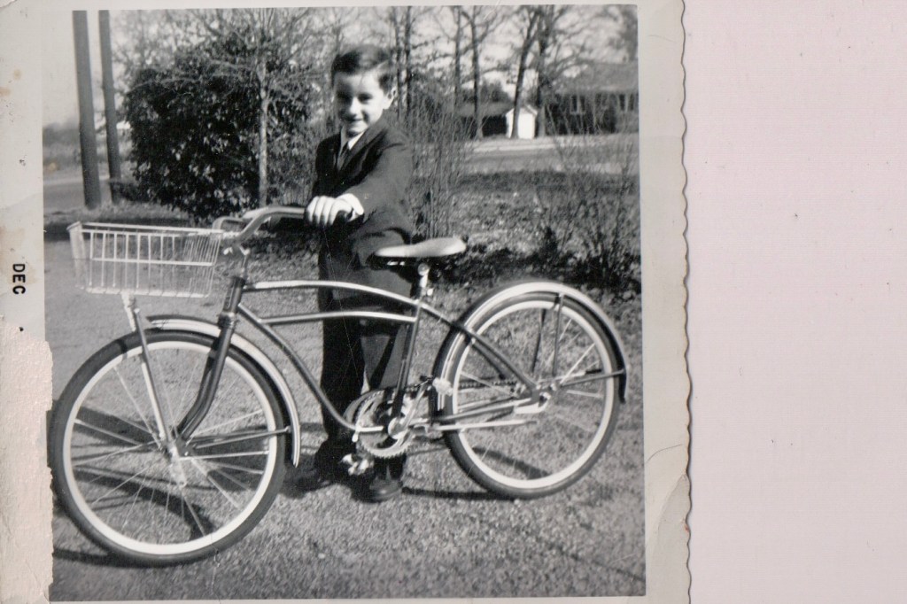 I see December on this old photo which I think indicates that it was my Christmas present in 1955. The bicycle came from Stewarts’ Western Auto store in Saluda about a mile from where I was photographed. It was my first bicycle after the hand-me-down that I learned to ride on. The Western Flyer stood twenty-four inches tall and had twin white pin stripes on the red fenders.